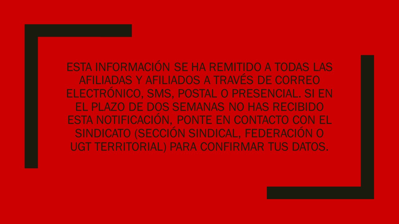 En este sentido, desde UGT Extremadura te solicitamos que mantengas tus datos debidamente actualizados para garantizar que en todo momento ésta información es veraz, y responde a tu situación real. Si los modificas, por favor, háznoslo saber para que estemos al corriente de tu situación actual y real.